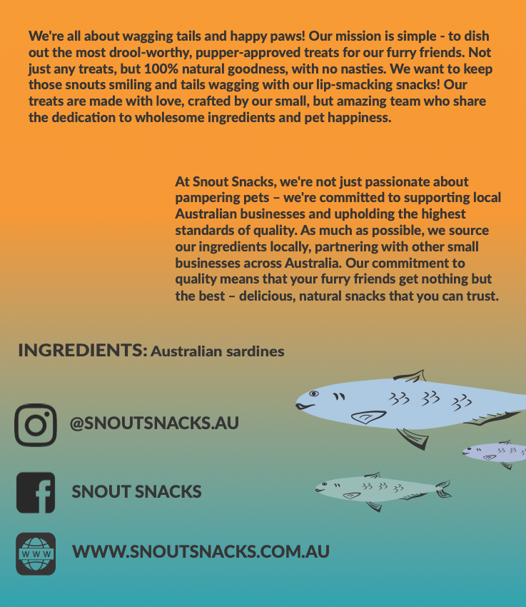 All Snout Snacks are made lovingly in Sydney, New South Wales by us. We use the freshest ingredients sourced from local farms and small businesses.